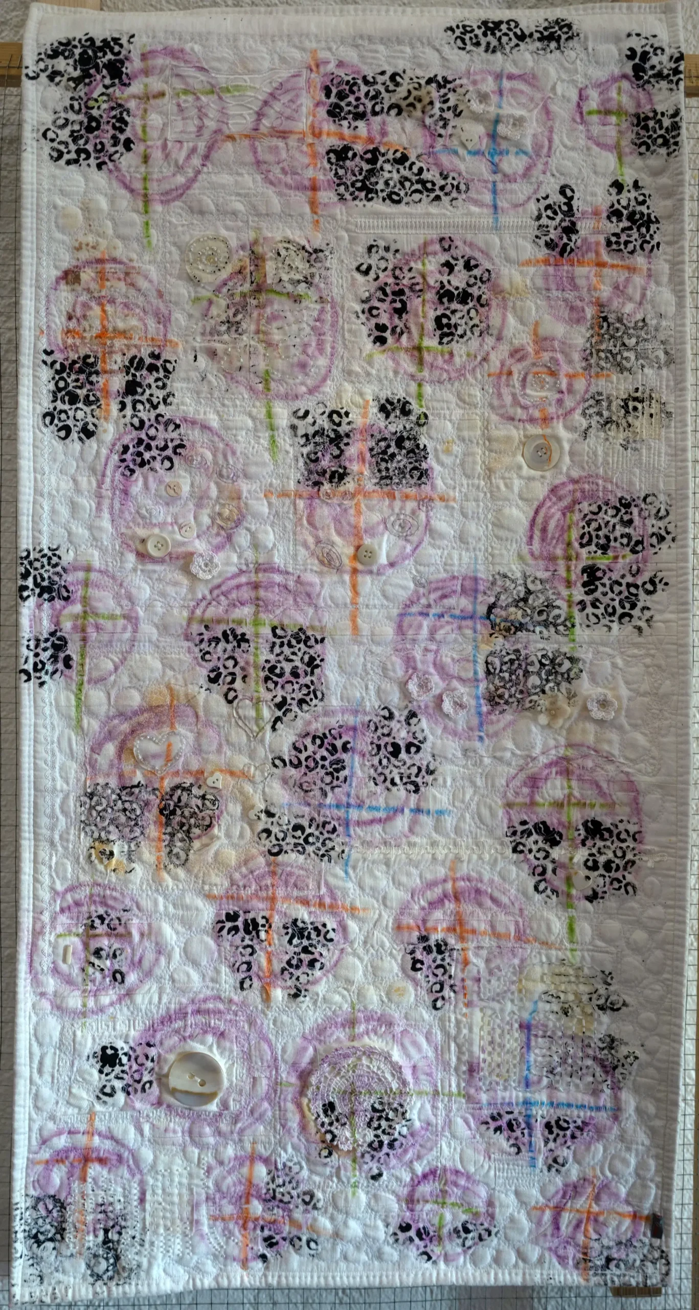 La artista trabaja sobre una base acolchada y blanca que actúa casi como un campo de silencio. Sobre ella, capas de estampación, dibujo y costura introducen un sistema de signos circulares y cruces suaves que parecen flotar entre lo doméstico y lo cartográfico. Los botones, bordados y aplicaciones no funcionan como detalle decorativo, sino como puntos de anclaje afectivo y matérico, reforzando una investigación coherente sobre memoria, superficie y construcción del relato a partir de elementos modestos. La pieza tiene algo de palimpsesto íntimo: una escritura visual que no se impone, pero permanece.